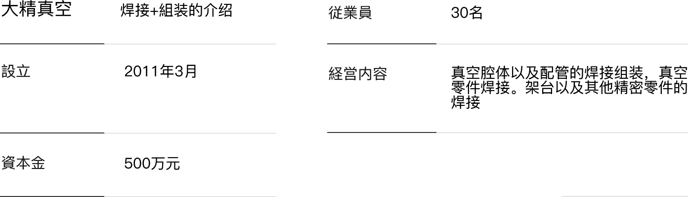 杭州大精真空技术有限公司成立于2010年,是完美·体育的子公司,是一家中日合资企业,总投资1000多万元,现有36名技术员工,拥有自动焊机,氮检漏等20多台设备,主要从事真空腔体的焊接组装,真空管接件的制造,主要客户有日本神钢集团,日立集团,华尔卡集团等。
